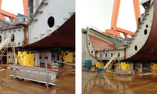 3. The main lifting hydraulic cylinders on the equipment are equipped with anti deviated load saddle & expanded chassis (5 degrees) to accommodate the hull’s uneven bottom section for ensuring the durability and safety.